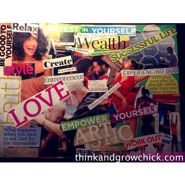 Typically, a vision board is a homemade collage of pictures of ideas, words, art or anything that inspires or motivates you (usually cutouts from old magazines) and looks like this: